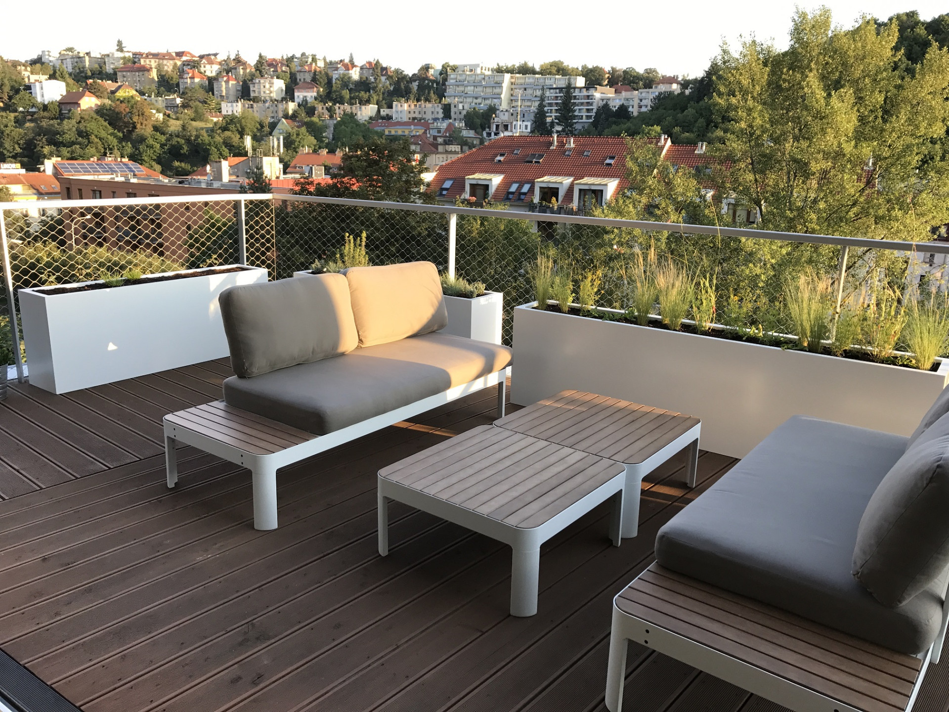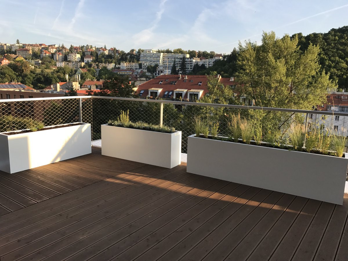 U tejto realizácie bol požiadavok investora na farebnosť kvetináčov jasný - šedivé truhlíky. Po našej prvej schôdzke priamo na terase sme investorovi navrhly iné farebné riešenia a tým boli biele vonkajšie truhlíky. Zdalo sa nám, že svetlo zladené zariadenie obytnej časti by malo plynule prechádzať tiež na terasu.