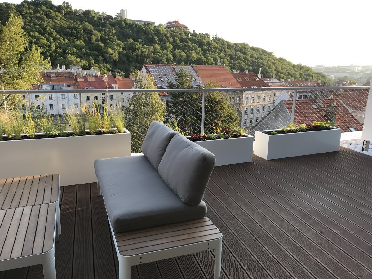 Finálna podoba nás presvedčila o tom, že farebné riešenie bolo zvolené správne.Výsledný dojem pôsobí veľmi jemne a dokonale korešponduje s interiérom bytu. Biele truhlíky jemne dotvárajú úchvatný výhľadna veľkomesto, ktorý je naozaj neopakovateľným zážitkom.