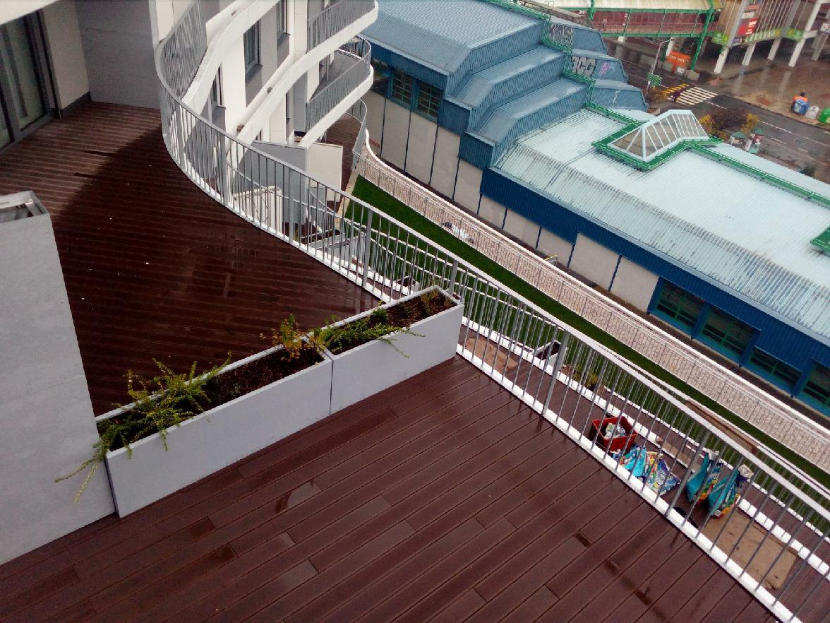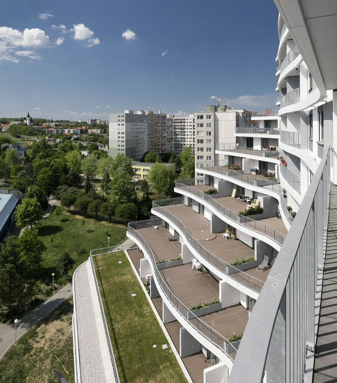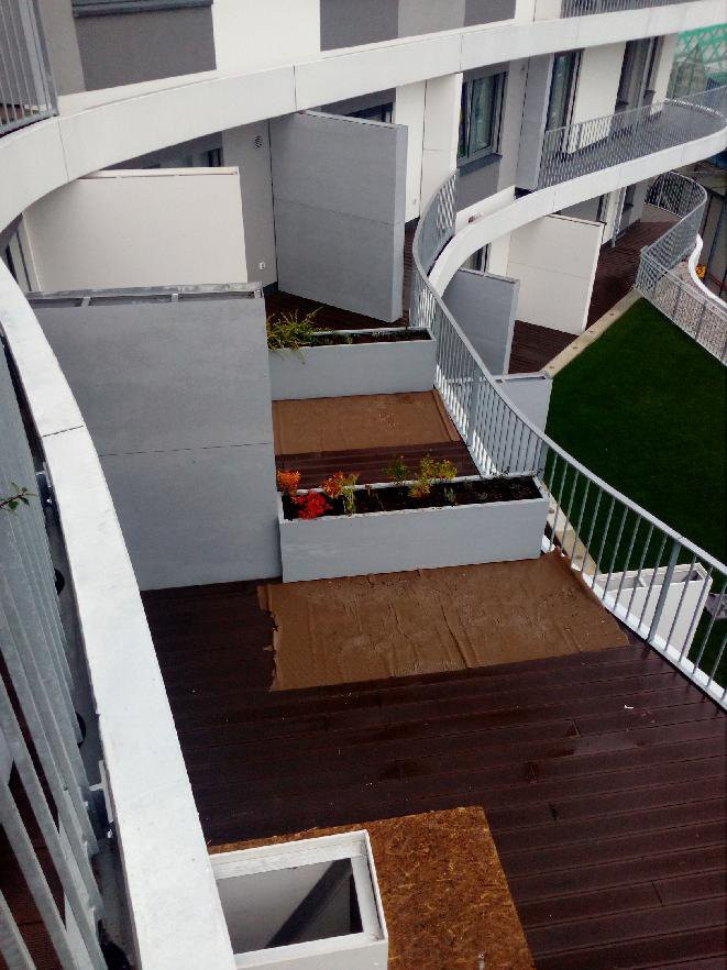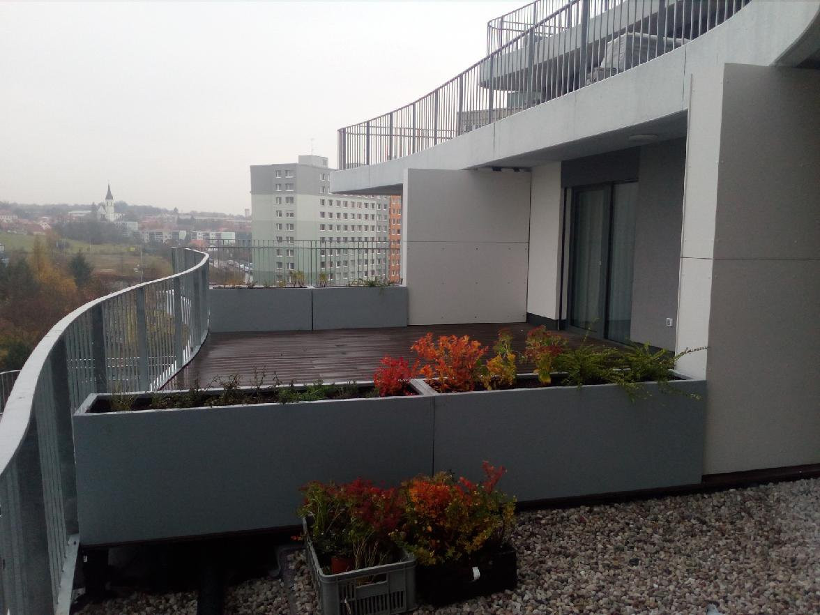 Tento bytový dom počítal už vo fáze projektu s umiestnením kvetináčov, ktoré plnia funkciu deliaceho prvku medzi jednotlivými terasami bytov. Toto jednoduché riešenie je aj u takto ohromného investičného zámeru veľmi účinné. Dotvára farebnú aj tvarovú koncepciu celého objektu a zároveň netradične rieši tiež oddelenie a odclonenie jednotlivých terás bytov. Vonkajšie terasy tak tvoria jednotný celok a ostáva len počkať, až rastliny v nádobách podrastú a ponúknu obyvateľom domu súkromie a zároveň zeleňa vzdušné prostredie. Do truhlíkov sme použili integrovaný zavlažovací systém. Samozavlažovacie kvetináče zaisťujú optimálnu závlahu pre rast zasadených kríkov.