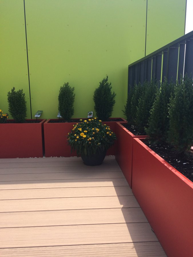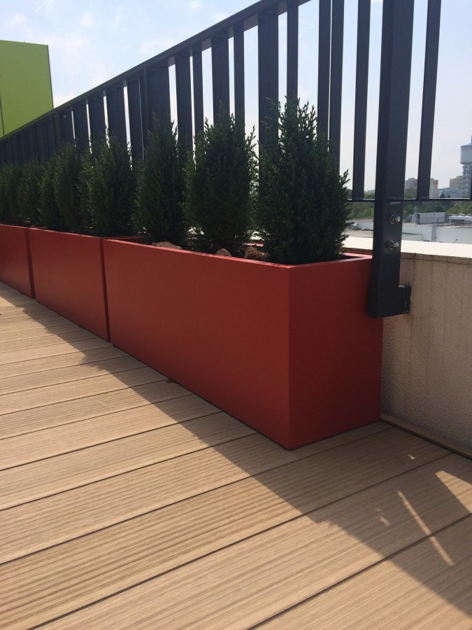 Túto výraznú farbu - tomatovo červenú RAL 3013 - sme zatiaľ poznali iba zo zahraničných realizácií. Veľké kocky pred nákupným centrom v severnom Írsku sú proste skvostné! V poslednej dobe sa ale aj medzi našimi zákazníkmi začínajú objavovať odvážlivci, ktorí sa neboja experimentovať a rozjasniť svoje okolie farbami. Jednou z prvých lastovičiek je aj táto súkromná vonkajšia terasa, ktorá vďaka sklolaminátovým truhlíkom v červenej farbe doslova ožila. Truhlíky majú rôzne veľkosti, aby sa docielilo optické zjednotenie tvaru terasy a celé dielo pôsobilo kompaktným dojmom. Truhlíky sú vybavené izoláciou, ktorá sa postará o koreňový systém v období mrazu či veľkého tepla. Inštalácia je teda celoročná. Odtokové otvory zase pomôžu zabrániť nežiaducemu podmáčaniu rastlín. Nechajte sa inšpirovať aj vy farebnými možnosťami našich kvetináčov, ktoré vymedzia a podtrhnú váš osobitý štýl.