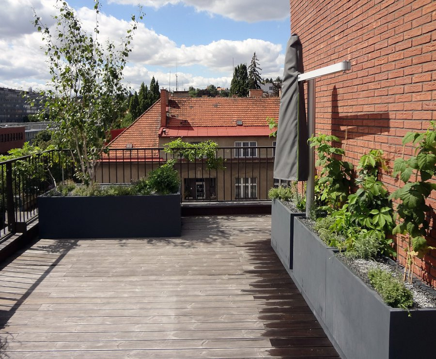 Úprava terasy priliehajúca k bytu v novostavbe v pražských Dejviciach nadväzujena minimalistický prístup v pojatí interiéru. Plochy zelene sú usporiadané dokompozície z pravouhlých ostrovov, ktoré myšlienkovo nadväzujú na charakterstávajúceho delenia terás medzi bytmi. Poetika terasy tak nie je danátvarovaním črepníkov, ale ich rozmiestnením a hlavne vizuálnym uplatnenímzelene samotnej. Hlavný pobytový priestor je logicky umiestnený v juhovýchodnejčasti terasy, kde vegetácia graduje v južnom nároží, kam je situovaná hlavnápestovateľská plocha. Sklolaminátové nádoby na terase sú riešené ako solitéry anadväzujú na koncept rozdeľovania terásmedzi susedmi. Jednoduché tvary črepníkov pútajú menej pozornosti a prenechajúviac pozornosti rastlinám samotným. Architekt: SKUTEK ARCHITECTURE