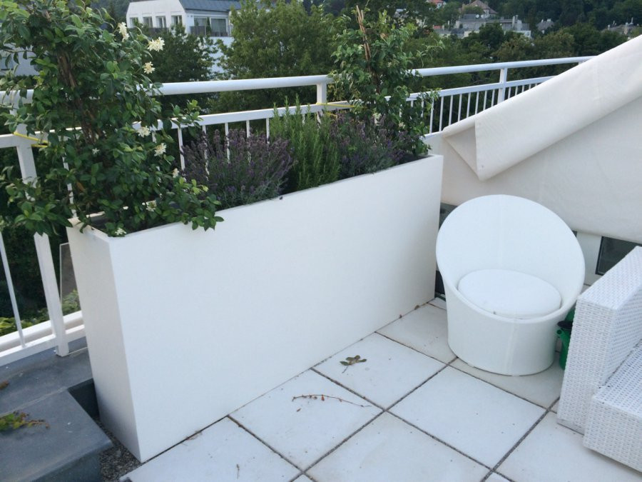 K našej veľkej radosti sa začíname obchodne presadzovať tiež za hranicami Českej republiky. V tomto prípade ide o súkromnú zákazku vonkajšej terasy vo Viedni, kde kvetináč dokonale plní funkciu odclonenia od okolitých domov. Majitelia bytu tak môžu využívať všetky výhody vonkajšej terasy. Veľkou výhodou vyrábaných kvetináčov sa okrem estetickej hodnoty opäť ukázala samotná váha našich výrobkov. Najväčší kvetináč tejto zákazky, ktorý má rozmery (200x35x90 cm), váži iba 30kg. To samozrejme veľmi uľahčuje manipuláciu a dopravu na miesto určenia. Dôležitejšia je skutočnosť, že nie je nadbytočne zaťažovaná strešná konštrukciadomu. S úsmevom hovoríme, že nás stavební statici majú radi.