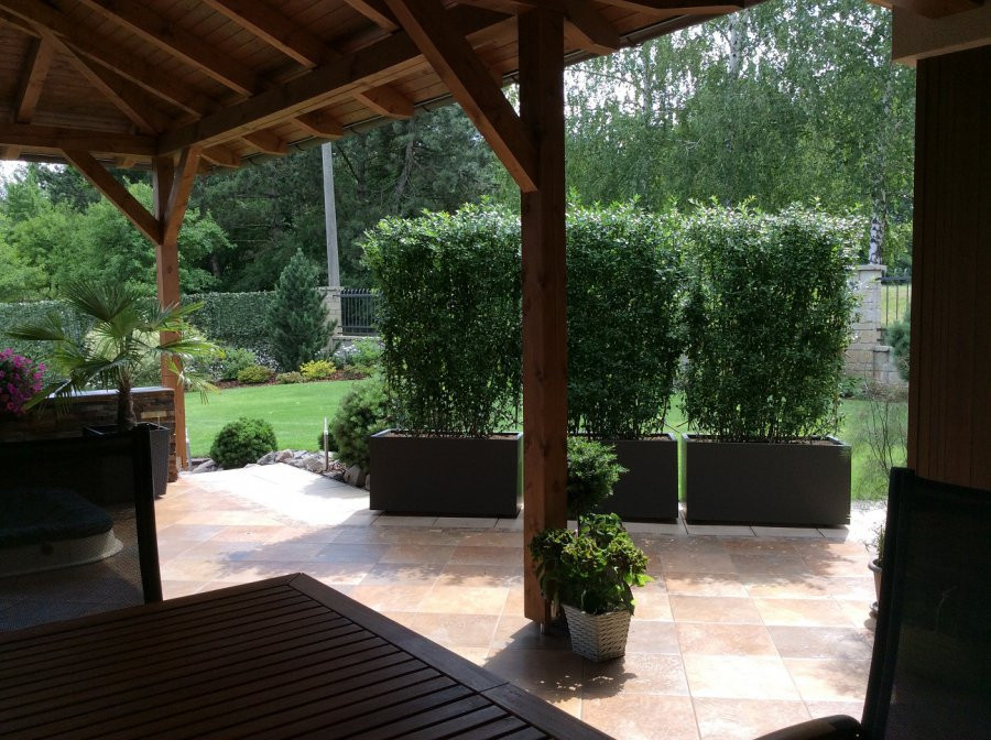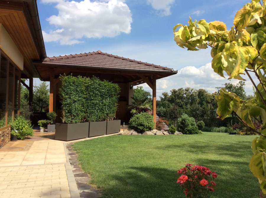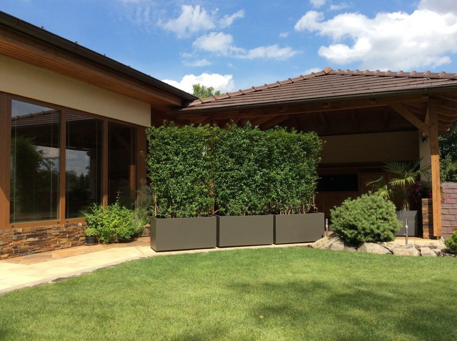 Táto realizácia sa nám obzvlášť páči! Na tomto príklade je úplne zjavné, že naše záhradné kvetináče neplnia len funkciu okrasnú, ale tiež praktickú! Majitelia si vtipne a ľahko vytvorili súkromie na otvorenej terase, ktorá plynule nadväzuje na trávnik a zvyšok rovnej záhrady. Veľkoobjemové truhlíky osadené vysokými rastlinami bránia pohľadom okoloidúcich. Čo už tak zjavné nie je, sú malé kolieska na spodnej strane kvetináčov, ktoré umožňujú jednoduchú manipuláciu. Majiteľom tým vznikol posuvný „zelený paravan“. Integrovaný závlahový systém zaistí primeranú zálievku aj v letných mesiacoch niekoľko dní. Čo by sme ešte chceli spomenúť je výber farebného odtieňu – tieňovej šedi. Celkový farebný koncept pôsobí veľmi decentne a vkusne. Ešte raz ďakujeme majiteľom za zaslané fotografie.