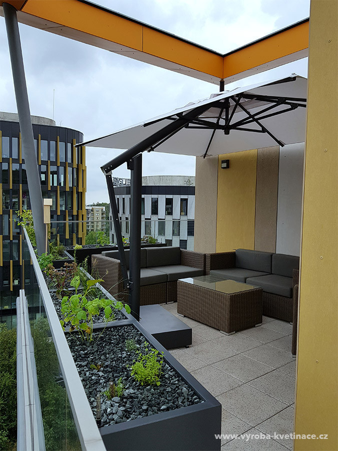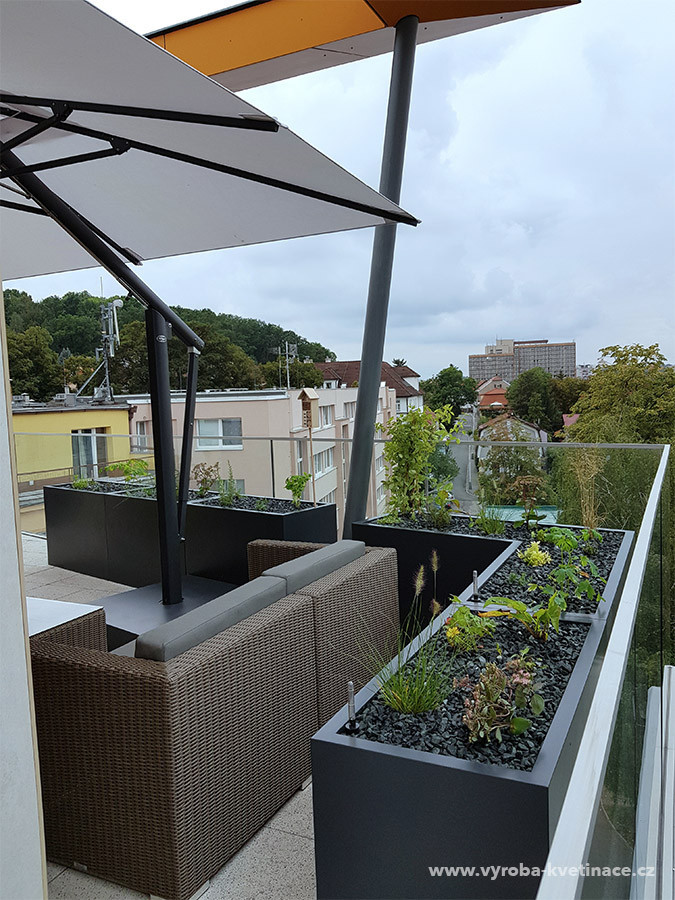 Realizácie záhrad a vonkajších terás väčšinou využívajú kvetináče štandardných tvarov, hranaté truhlíky a kvetináče v tvare kvádra. Výroba kvetináčov na zákazku však umožňuje aj netradičné riešenia, ktoré sa vo finálnom výsledku dokonale prispôsobia danému miestu a požiadavkám. V tomto prípade ide o súkromnú vonkajšiu terasu, kde kvetináče plnia funkciu odclonenia od vonkajšej komunikácie a tvoria elegantnú zástenu na terase. Terasa tak získala príjemné súkromie a v neposlednom rade tiež obohatenie o krásu zelene. Štandardné kvetináče v tvare kvádra v tejto realizácii doplňuje atypický kvetináč v tvare L, ktorý v rohovej časti zviera uhol 106°, a presne kopíruje zábradlie terasy.