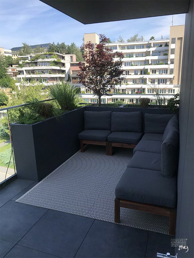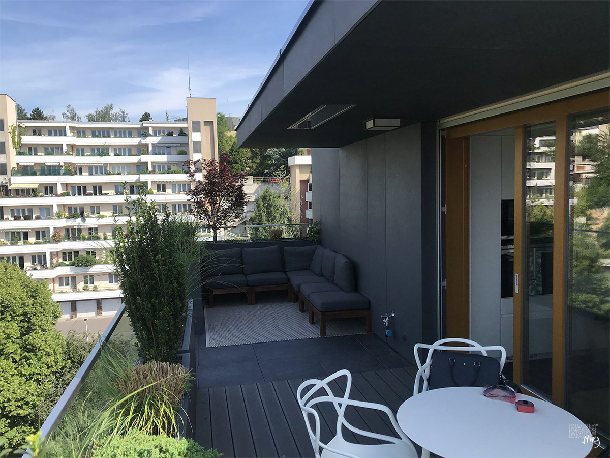 Nádherná realizácia na terase bytového domu nám dala možnosť využiť výhody sklolaminátových kvetináčov v plnej miere. Veľké hranaté kvetináče v tvare horizontálneho kvádra vytvára okrem príjemného prostredia zelene aj diskrétne súkromie.
