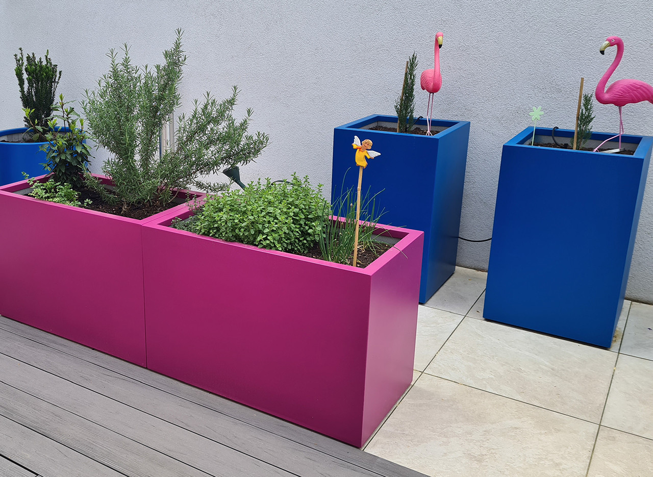 Kombinácia hranatých a valcových kvetináčov v troch výrazných farebných odtieňoch – purpurový, žltý a modrý (RAL 4006 – Dopravná purpurová | RAL 1023 – Dopravná žltá | RAL 5017 – Dopravná modrá) ponúka úžasný výsledok originálneho, ale harmonického priestoru.