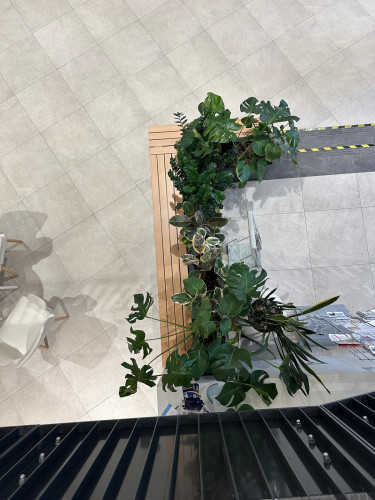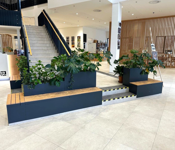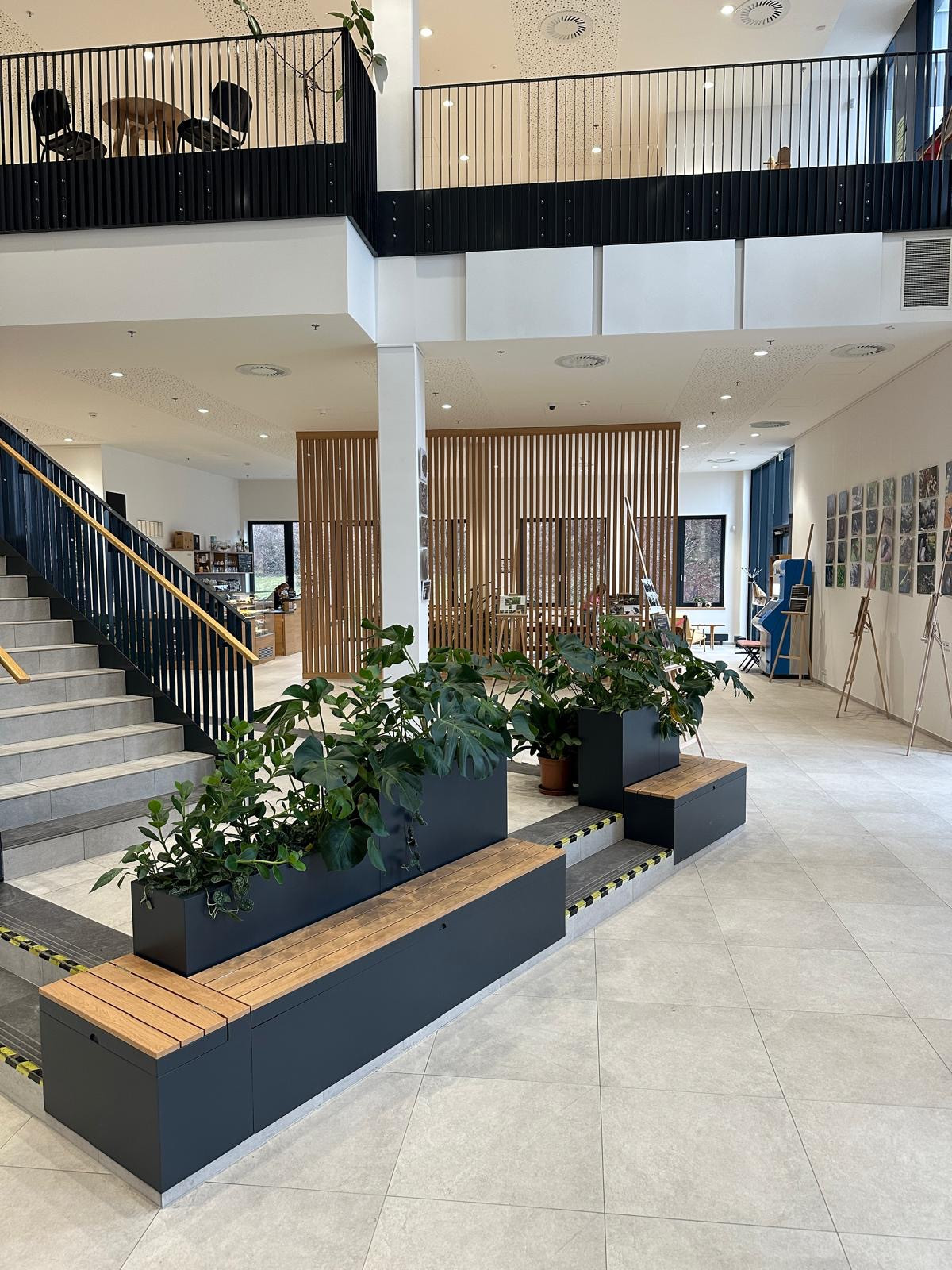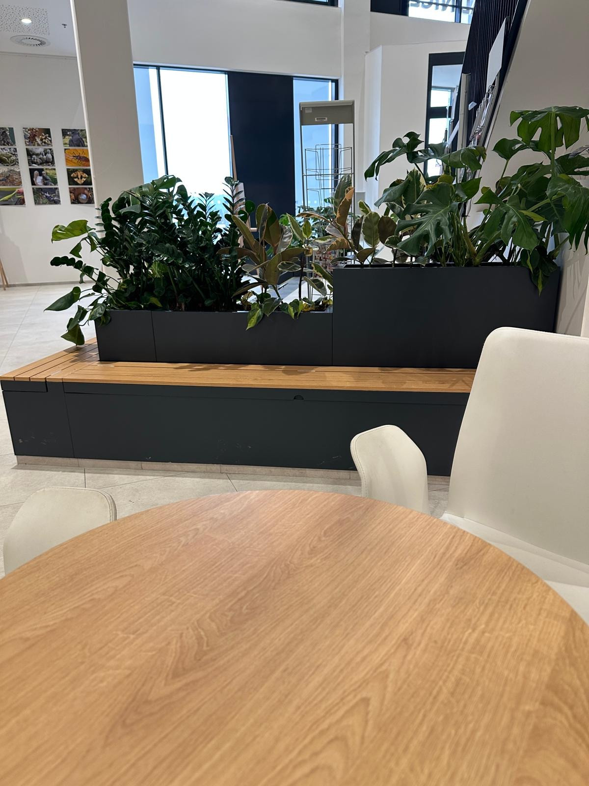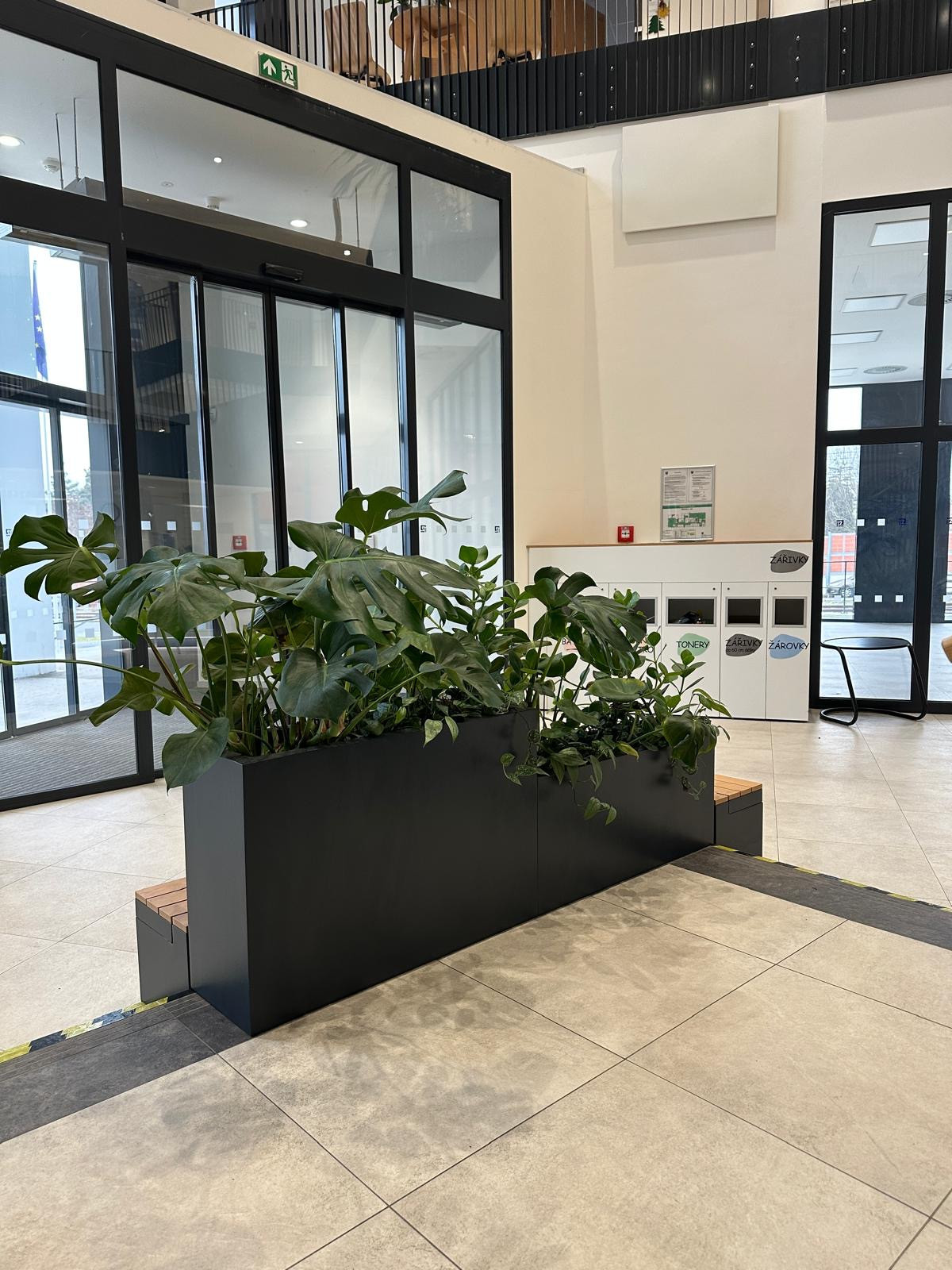 Vstupná hala RADNICE na Prahe 12 prešla premenou interiéru. Prepojením rôznych dĺžok kvetináčov na mieru a dreveného sedacieho prvku získali návštevníci možnosť príjemného vstupného priestoru, ktorý pôsobí menej úradne. Sklolaminátové kvetináče v antracitovom odtieni (RAL 7016) umocnili kontrast dreva a zvýraznili zelenú výsadbu. Tmavé kvetináče hranatého tvaru sú veľmi obľúbeným produktom u zákazníkov, pôsobia decentne a minimalisticky. Kvetináče vytvorili funkčnú zástenu v kombinácii rozdielnych rozmerov kvádrov.